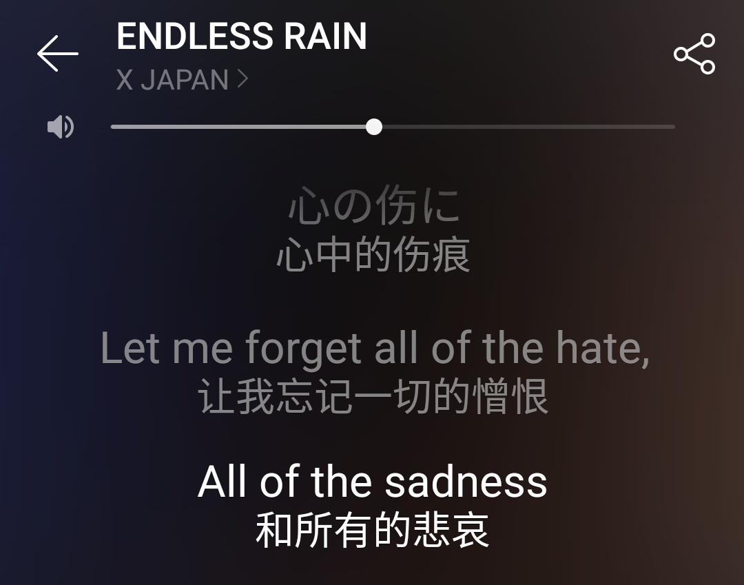 咱们聊天时我总旁敲侧击地想去KTV,实际上我只是想给你唱一次《Endless Rain》,我希望把你当年带给我的那份真挚鲜活的感触用这种方式还给你,就像Yoshiki在歌词里写的那样,对我来说 “Let me forget all of the hate and all of the sadness.” 的人,是运动会时坐在我旁边,开心地诉说自己对世界细腻洞察的你。